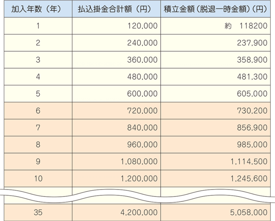 積立中の給付額試算表(脱退一時金)月払に5口(5,000円)加入の場合